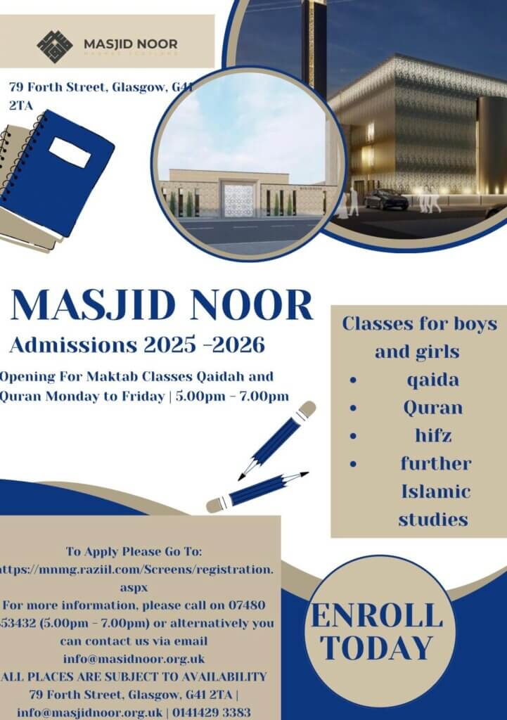 Masjid Noor is a thriving Mosque situated in the heart of the vibrant, multicultural community of Pollokshields, Glasgow.
